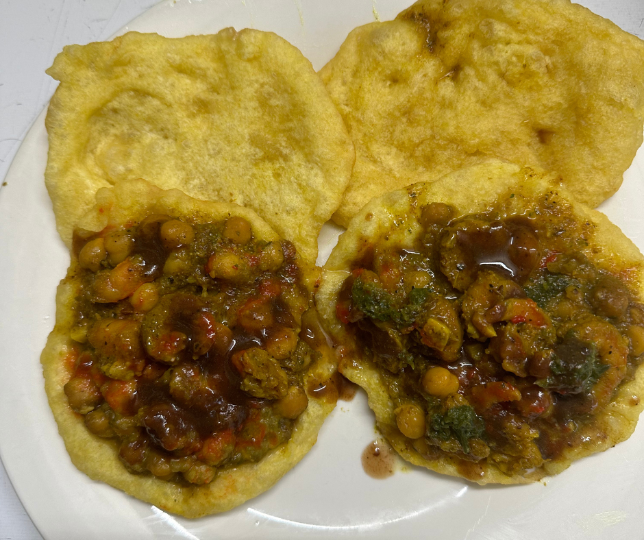 Curried chickpeas sandwiched between two fried flat breads